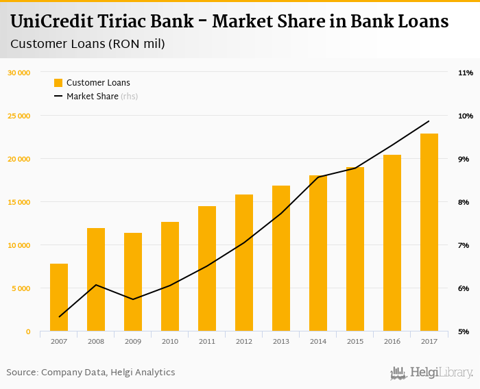 UniCredit Tiriac Bank's customer loans reached RON 22,951 mil in 2017, up 12.1% compared to the previous year.