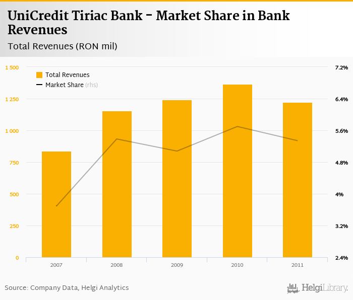 As a result, UniCredit Tiriac Bank accounted for 5.34% of all bank revenues generated by banks in Romania in 2011. Historically, the bank’s market share in total revenues reached an all time high of 5.70% in 2010 and an all time low of 3.69% in 2007.