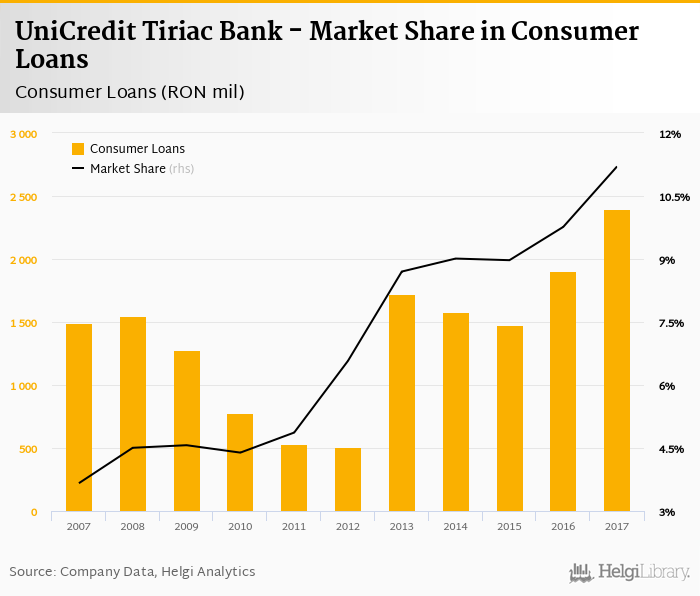 UniCredit Tiriac Bank's consumer loans reached RON 2,395 mil in 2017, up 25.5% compared to the previous year.