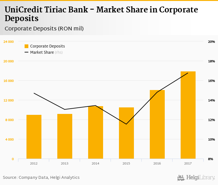 UniCredit Tiriac Bank accounted for 16.8% of all corporate deposits taken by banks in Romania at the end of 2017. Historically, the bank’s market share in corporate deposits reached an all time high of 16.8% in 2017 and an all time low of 11.5% in 2015.