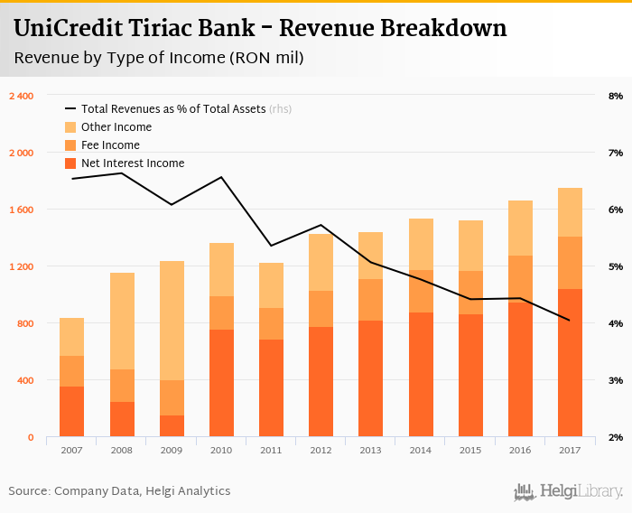 Comparing UniCredit Tiriac Bank with its closest peers, Banca Commerciala Romana generated total revenues of 4.07% of assets in 2017, BRD Groupe Societe Generale operated with 5.07% revenue margin and Raiffeisen Bank Romania produced total income worth 5.78% of assets.