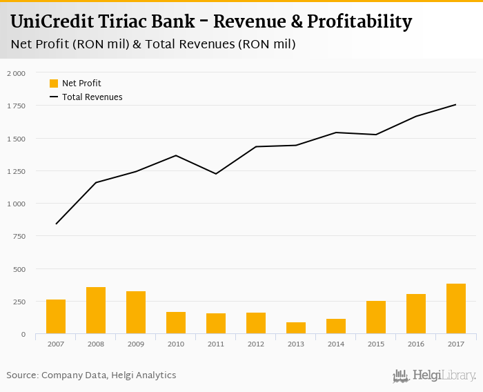 UniCredit Tiriac Bank made a net profit of RON 385 mil under revenues of RON 1,754 mil in 2017, up 24.8% and 5.44% respectively compared to the previous year.