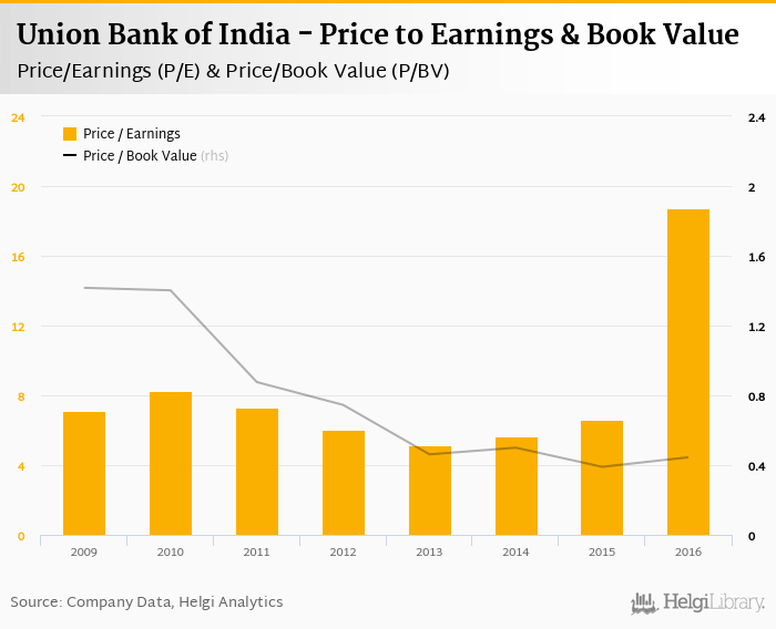 Union Bank of India stock traded at INR 156 per share at the end 2016 implying a market capitalization of USD 1,577 mil.