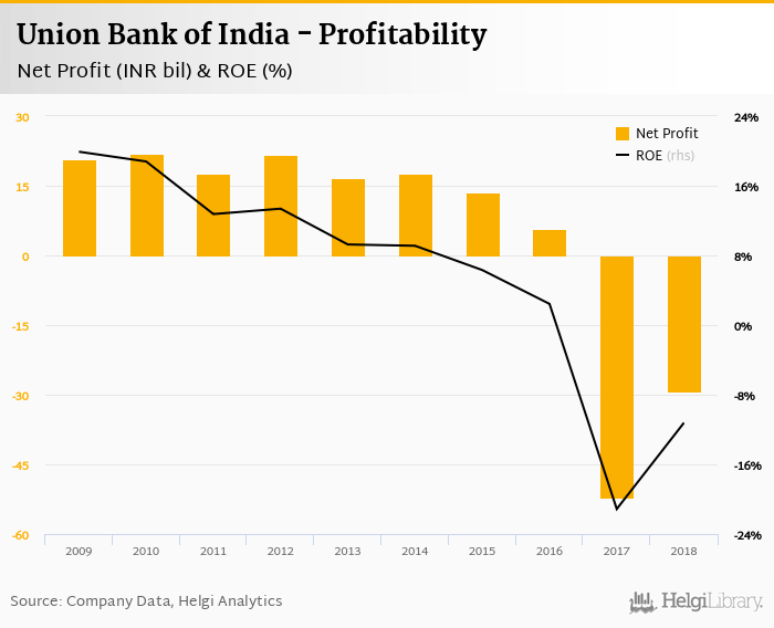 Union Bank of India made a net profit of INR -29.2 bil in 2018, up 43.9% compared to the previous year. This implies a return on equity of -11.2%.