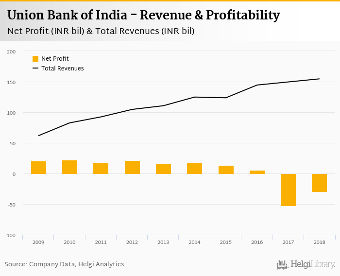 Union Bank of India made a net profit of INR -29.2 bil under revenues of INR 155 bil in 2018, up 43.9% and 3.38% respectively compared to the previous year.