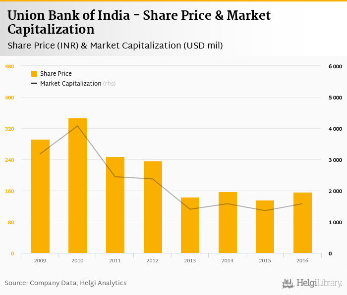 Union Bank of India stock traded at INR 156 per share at the end of 2016 implying a market capitalization of USD 1,577 mil.