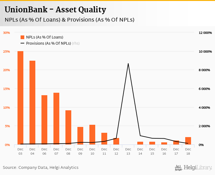 UnionBank's non-performing loans reached 2.06% of total loans at the end of 2018-12-31, up from 1.19% compared to the previous year. Historically, the NPL ratio hit an all time high of 25.0% in 2003-12-31 and an all time low of 0.109% in 2013-12-31.