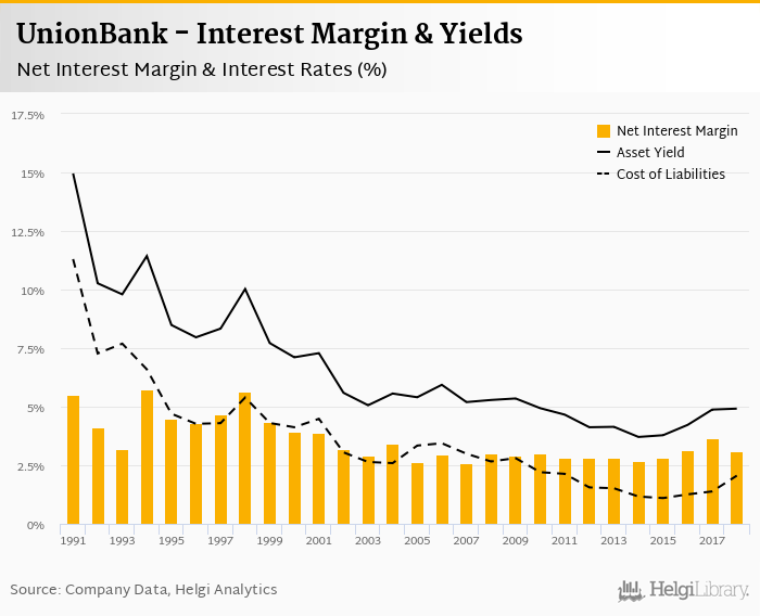 UnionBank's net interest margin amounted to 3.12% in 2018, down from 3.66% compared to the previous year.