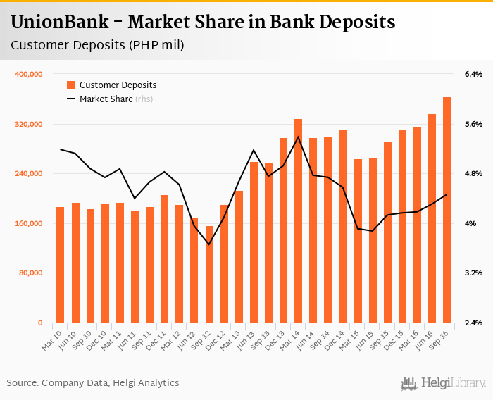 UnionBank's customer deposits reached PHP 363,962 mil in 2016-09-30, up 8.19% compared to the previous year.