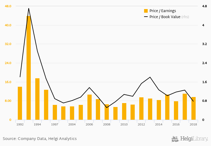 In terms of price to book value, the stock reached 0.772x at the end of 2018. Since 2013, the multiple reached an all time high of 1.26x in 2014 and an all time low of 0.772x in 2018 with an average of 1.09x.