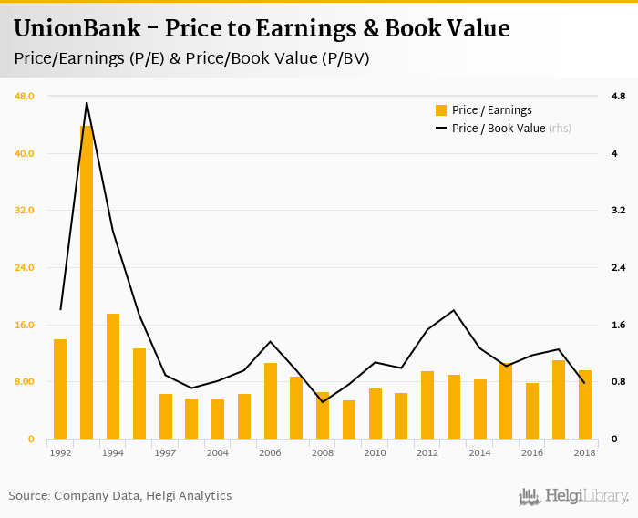 UnionBank stock traded at PHP 64.0 per share at the end 2018 implying a market capitalization of USD 1,486 mil.