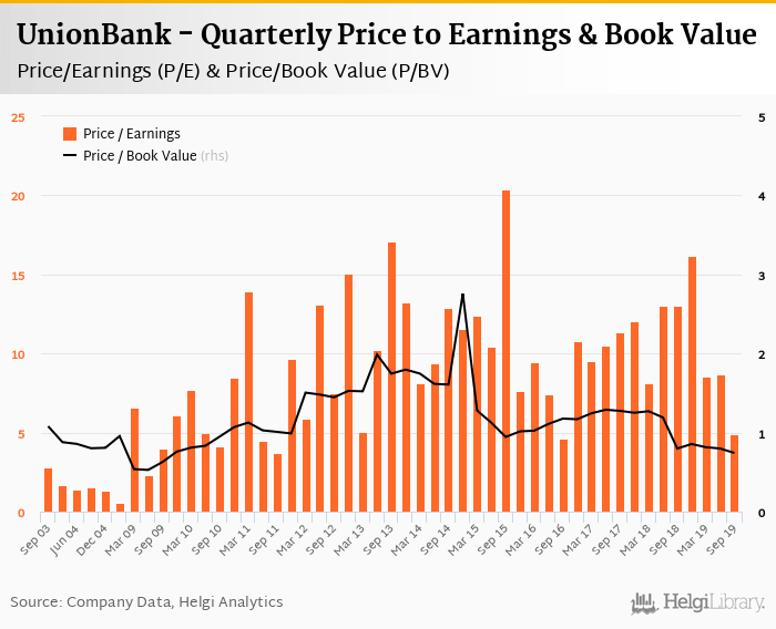 At the end of 3Q2019, the bank traded at price to earnings of 4.87x. Within the last five years, the multiple reached an all time high of 20.4x in 3Q2015 and an all time low of 4.61x in 3Q2016 with an average of 10.5x.