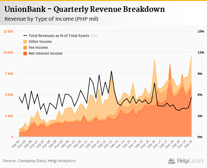 UnionBank generated total banking revenues of PHP 9,649 mil in the third quarter of 2019, up 61.7% when compared to the same period of last year and 33.7% when compared to the previous quarter.
