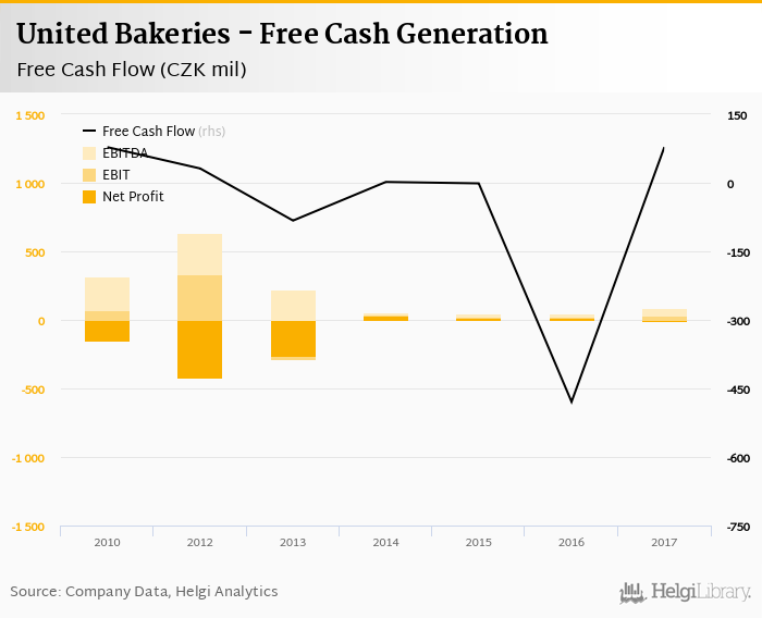 United Bakeries made a net profit of CZK -4.54 mil with revenues of CZK 2,207 mil in 2017, down by 124% and up by 712%, respectively, compared to the previous year. This translates into a net margin of -0.206%.