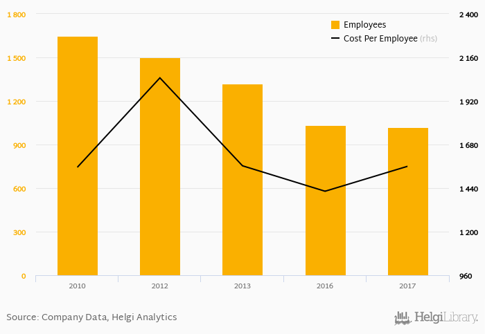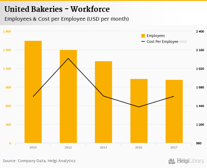 United Bakeries employed 1,017 employees in 2017, down 1.74% compared to the previous year. Historically, between 2010 and 2017, the firm's workforce hit a high of 1,647 employees in 2010 and a low of 0 employees in 2014.