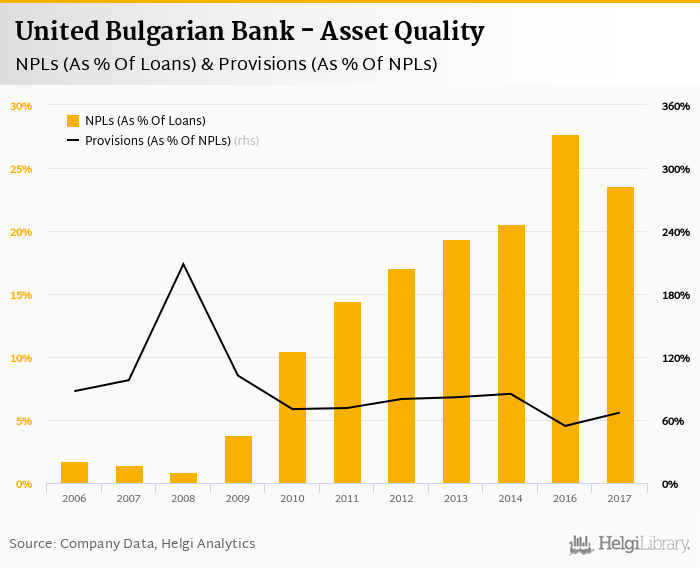 Comparing United Bulgarian Bank with its closest peers, DSK Bank operated at the end of 2017 with NPL ratio of 11.2% and provision coverage of 92.3%, UniCredit Bulbank with 8.10% and 82.5% respectively and Raiffeisenbank Bulgaria had 4.33% of bad loans covered with 89.0% by provisions at the end of 2017.