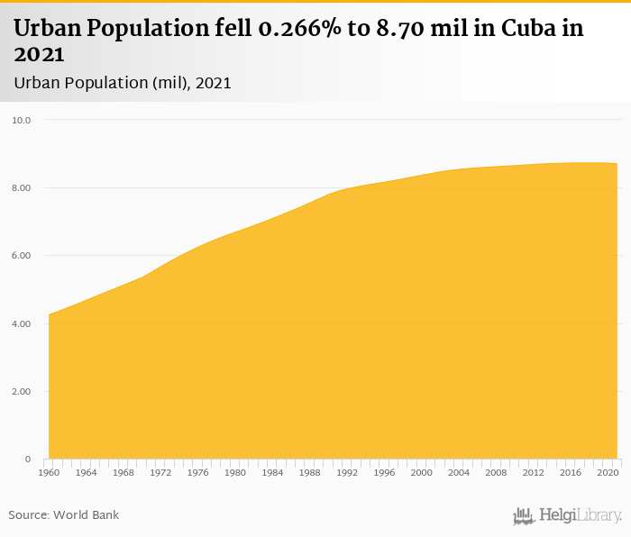Urban population fell 0.266% to 8.70 mil in Cuba in 2021, according to the National Statistical Office.