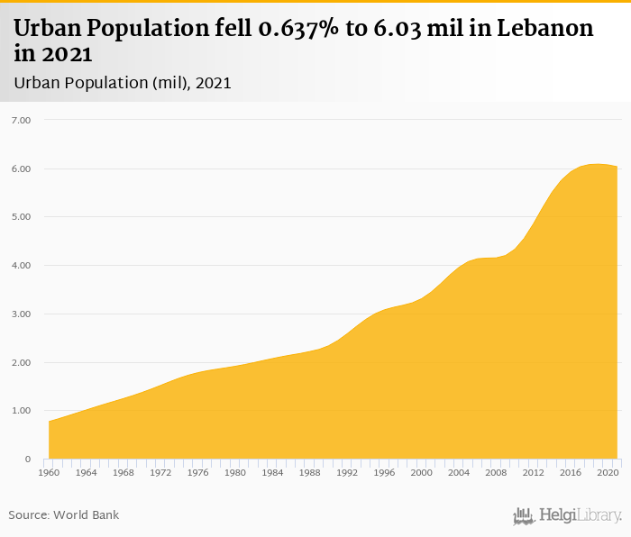 Urban population fell 0.637% to 6.03 mil in Lebanon in 2021, according to the National Statistical Office.