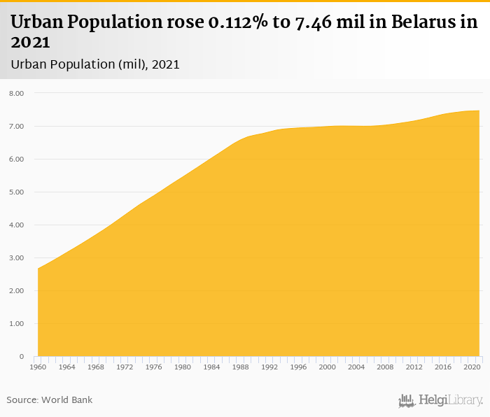 Urban population rose 0.112% to 7.46 mil in Belarus in 2021, according to the National Statistical Office.