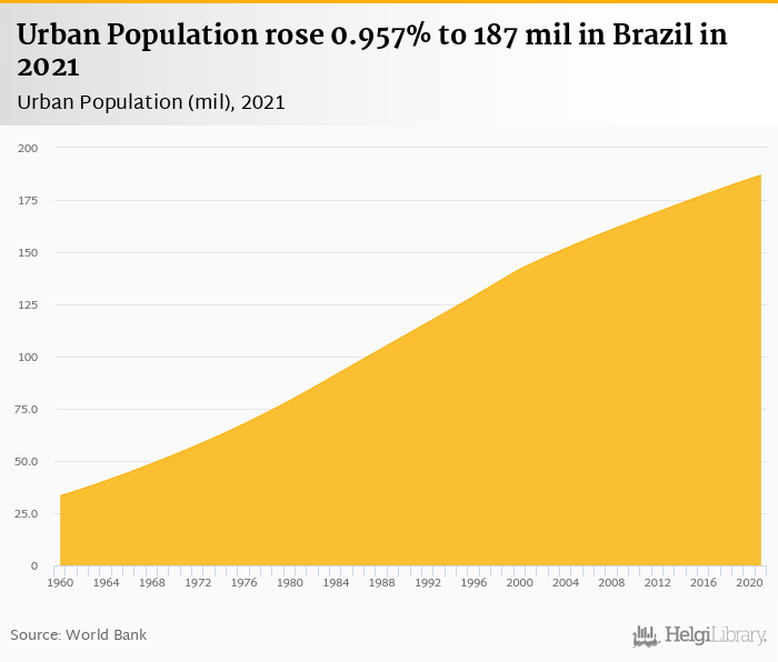 Urban population rose 0.957% to 187 mil in Brazil in 2021, according to the National Statistical Office.