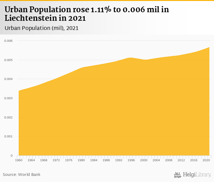 Urban population rose 1.11% to 0.006 mil in Liechtenstein in 2021, according to the National Statistical Office.