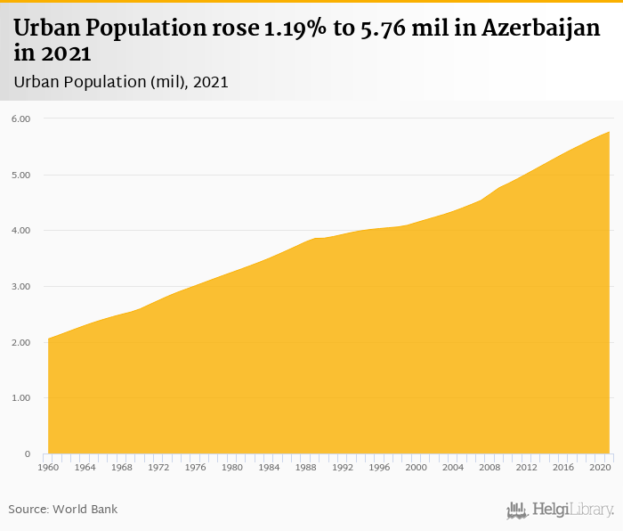 Urban population rose 1.19% to 5.76 mil in Azerbaijan in 2021, according to the National Statistical Office.