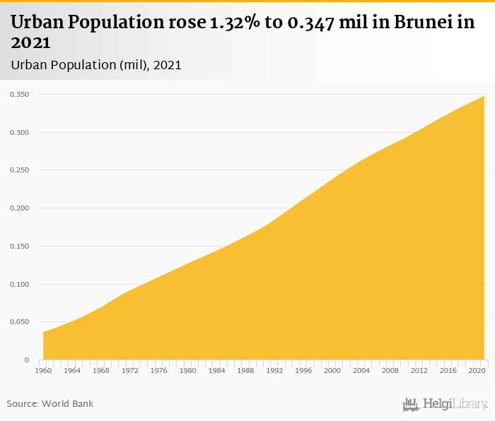 Urban population rose 1.32% to 0.347 mil in Brunei in 2021, according to the National Statistical Office.