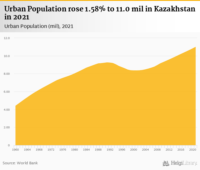 Urban population rose 1.58% to 11.0 mil in Kazakhstan in 2021, according to the National Statistical Office.