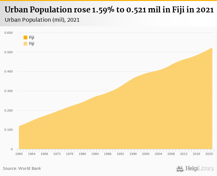 Urban population rose 1.59% to 0.521 mil in Fiji in 2021, according to the National Statistical Office.
