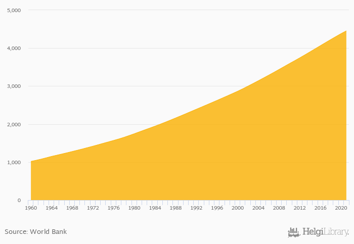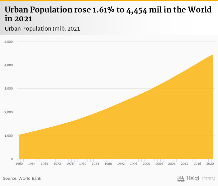 Urban population rose 1.61% to 4,454 mil in the World in 2021, according to the National Statistical Office.