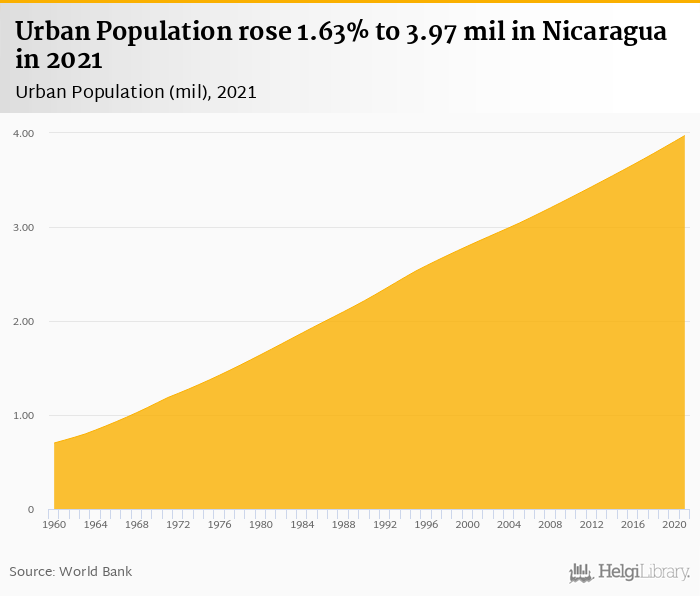 Urban population rose 1.63% to 3.97 mil in Nicaragua in 2021, according to the National Statistical Office.