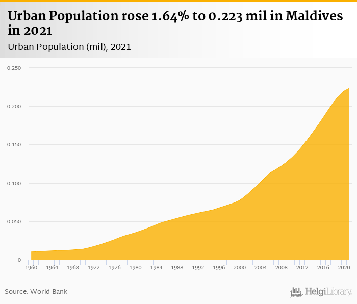 Urban population rose 1.64% to 0.223 mil in Maldives in 2021, according to the National Statistical Office.