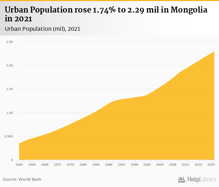 Urban population rose 1.74% to 2.29 mil in Mongolia in 2021, according to the National Statistical Office.