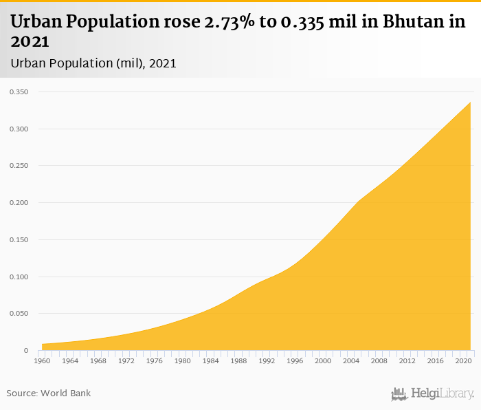 Urban population rose 2.73% to 0.335 mil in Bhutan in 2021, according to the National Statistical Office.