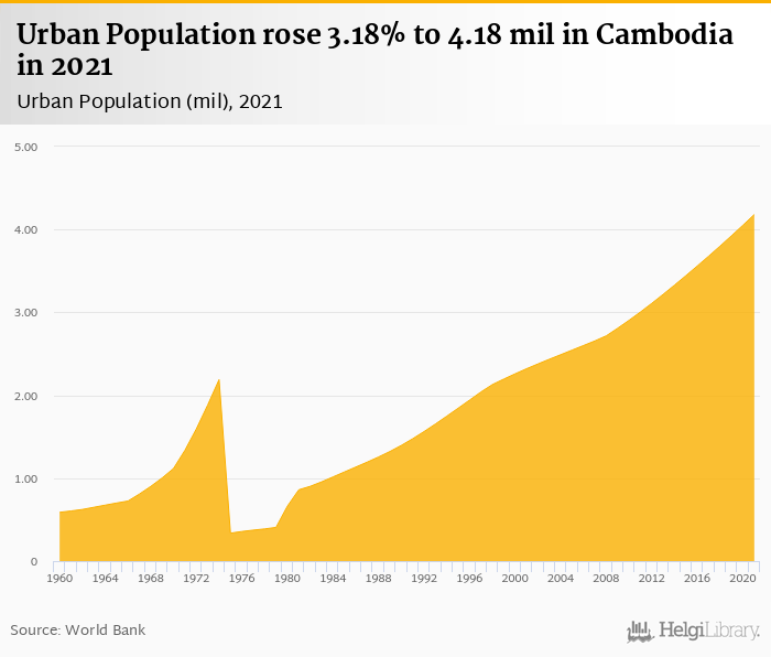 Historically, urban population in Cambodia reached an all time high of 4.18 mil in 2021 and an all time low of 0.337 mil in 1975. When compared to Cambodia's main peers, urban population in China amounted to 883 mil, 2.73 mil in Laos, 36.5 mil in Thailand and 37.4 mil in Vietnam in 2021.