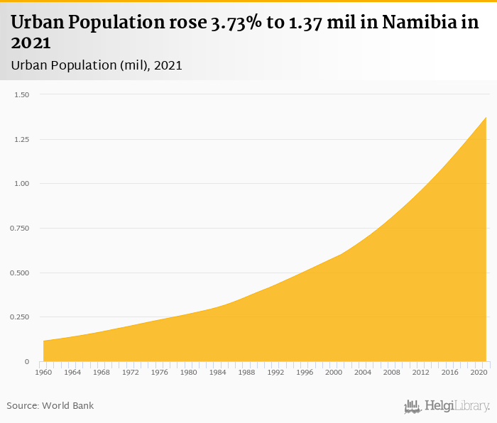 Urban population rose 3.73% to 1.37 mil in Namibia in 2021, according to the National Statistical Office.