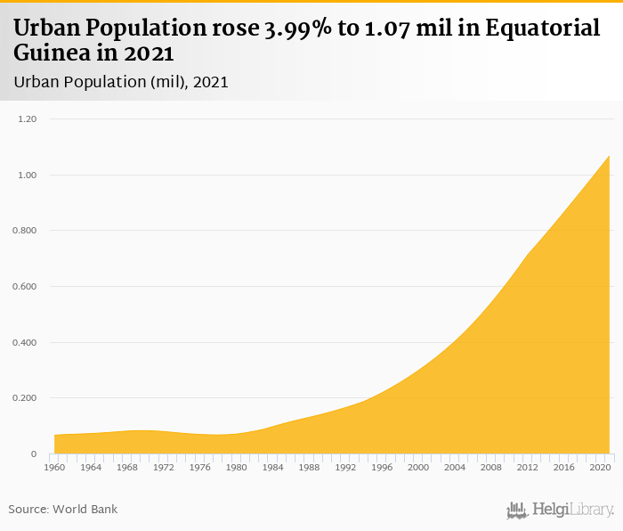Urban population rose 3.99% to 1.07 mil in Equatorial Guinea in 2021, according to the National Statistical Office.