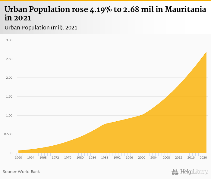 Urban population rose 4.19% to 2.68 mil in Mauritania in 2021, according to the National Statistical Office.