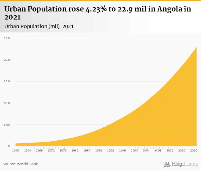 Urban population rose 4.23% to 22.9 mil in Angola in 2021, according to the National Statistical Office.
