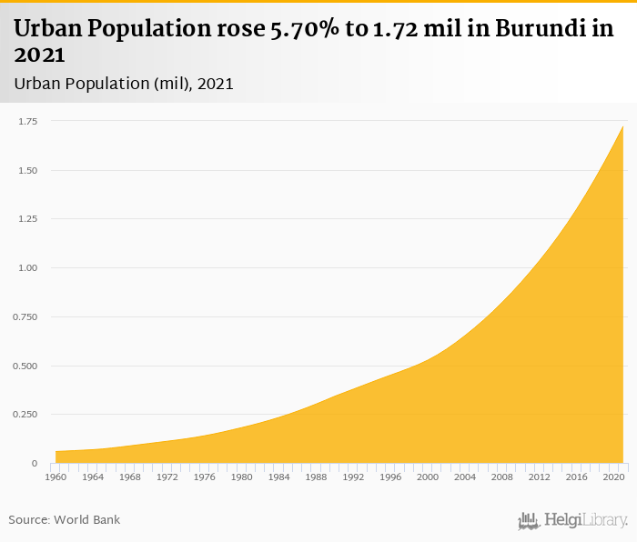 Urban population rose 5.70% to 1.72 mil in Burundi in 2021, according to the National Statistical Office.