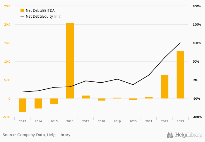 Historically, the firm’s net debt to equity reached a high of 101% in 2023 and a low of -33.0% in 2013 between 2013 and 2023. The average for the last five years was 32.4%.