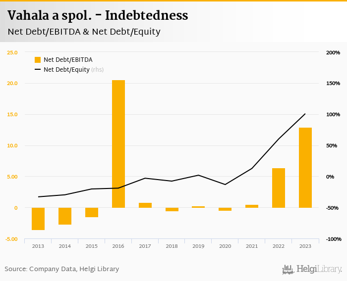 Vahala a spol.'s net debt stood at CZK 104 mil and accounted for 101% of equity at the end of 2023. The ratio is up 40.8 pp compared to the previous year.