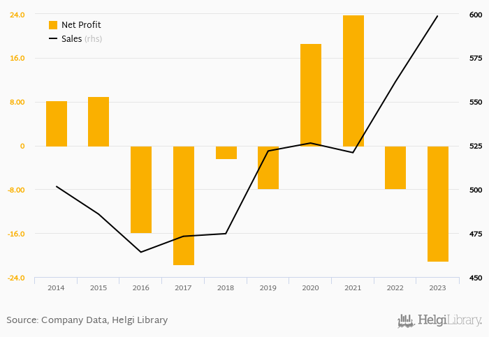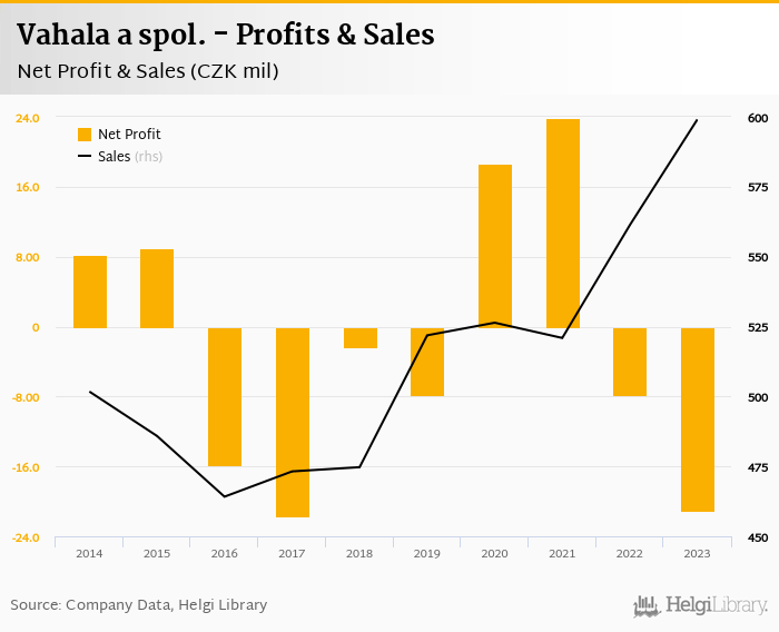 Vahala a spol. made a net profit of CZK -21.0 mil in 2023, down 170% compared to the previous year. Total sales reached CZK 599 mil, which is up 6.73% when compared to the previous year.