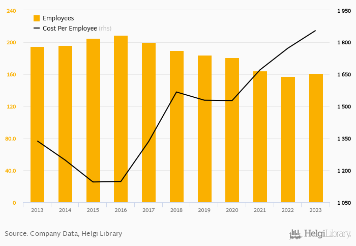 Staff cost represented 13.5% of sales in 2023, 1.22 pp higher than a decade ago.