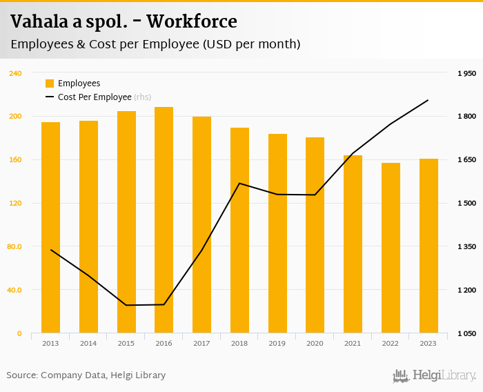 Vahala a spol. employed 161 employees in 2023, up 2.55% compared to the previous year. Historically, between 2013 and 2023, the firm's workforce hit a high of 209 employees in 2016 and a low of 157 employees in 2022.