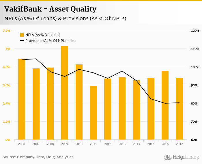 VakifBank's non-performing loans reached 4.08% of total loans at the end of 2017, down from 4.55% compared to the previous year. Historically, the NPL ratio hit an all time high of 6.17% in 2009 and an all time low of 3.57% in 2011.