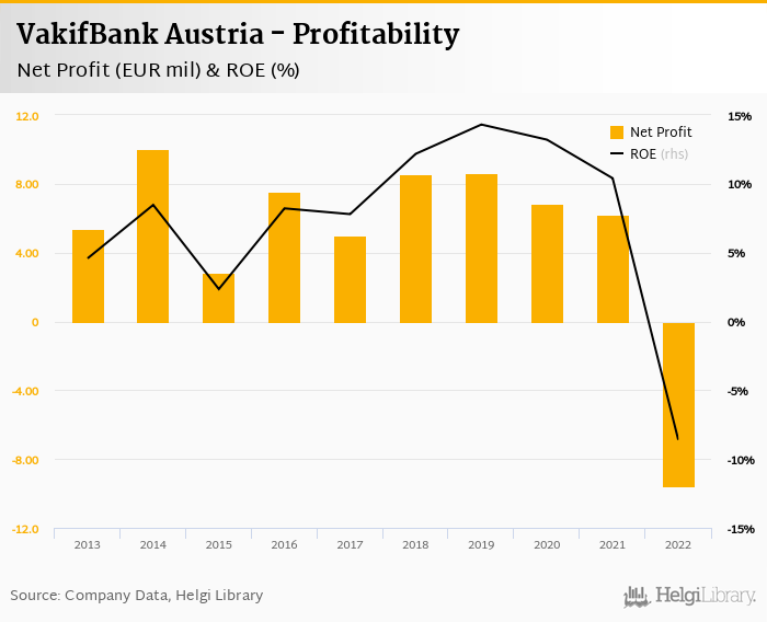 VakifBank Austria made a net profit of EUR -9.57 mil in 2022, down 254% compared to the previous year. This implies a return on equity of -8.61%.