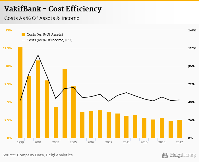 Comparing VakifBank with its closest peers, Isbank operated in 2017 with a cost to income ratio of 54.7% in 2017, Garanti Bank reached 38.8% and Yapi Kredi Bank some 42.5%.