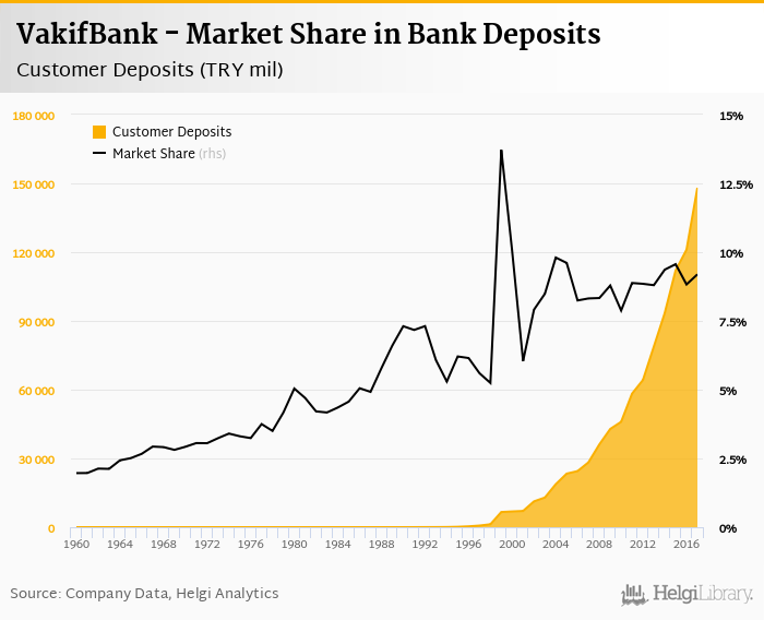 VakifBank accounted for 9.19% of all customer deposits taken by banks in Turkey at the end of 2017. Historically, the bank’s market share in customer deposits reached an all time high of 13.7% in 1999 and an all time low of 1.97% in 1960.