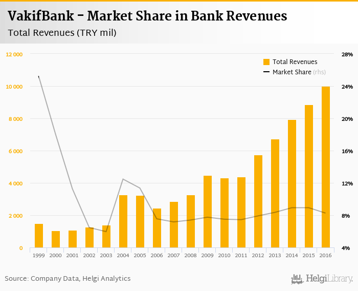 As a result, VakifBank accounted for 8.26% of all bank revenues generated by banks in Turkey in 2016. Historically, the bank’s market share in total revenues reached an all time high of 25.2% in 1999 and an all time low of 5.96% in 2003.